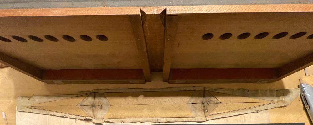 They could instead have allowed the bellows edges to protrude downward from the board. This would have added another centimetre to the depth. Given that this instrument doesn’t fold up into a box, the depth isn’t at a premium. For the cost of extra time profiling the wood and the unpredictability of the glue-up, I don’t think this was a wise decision.